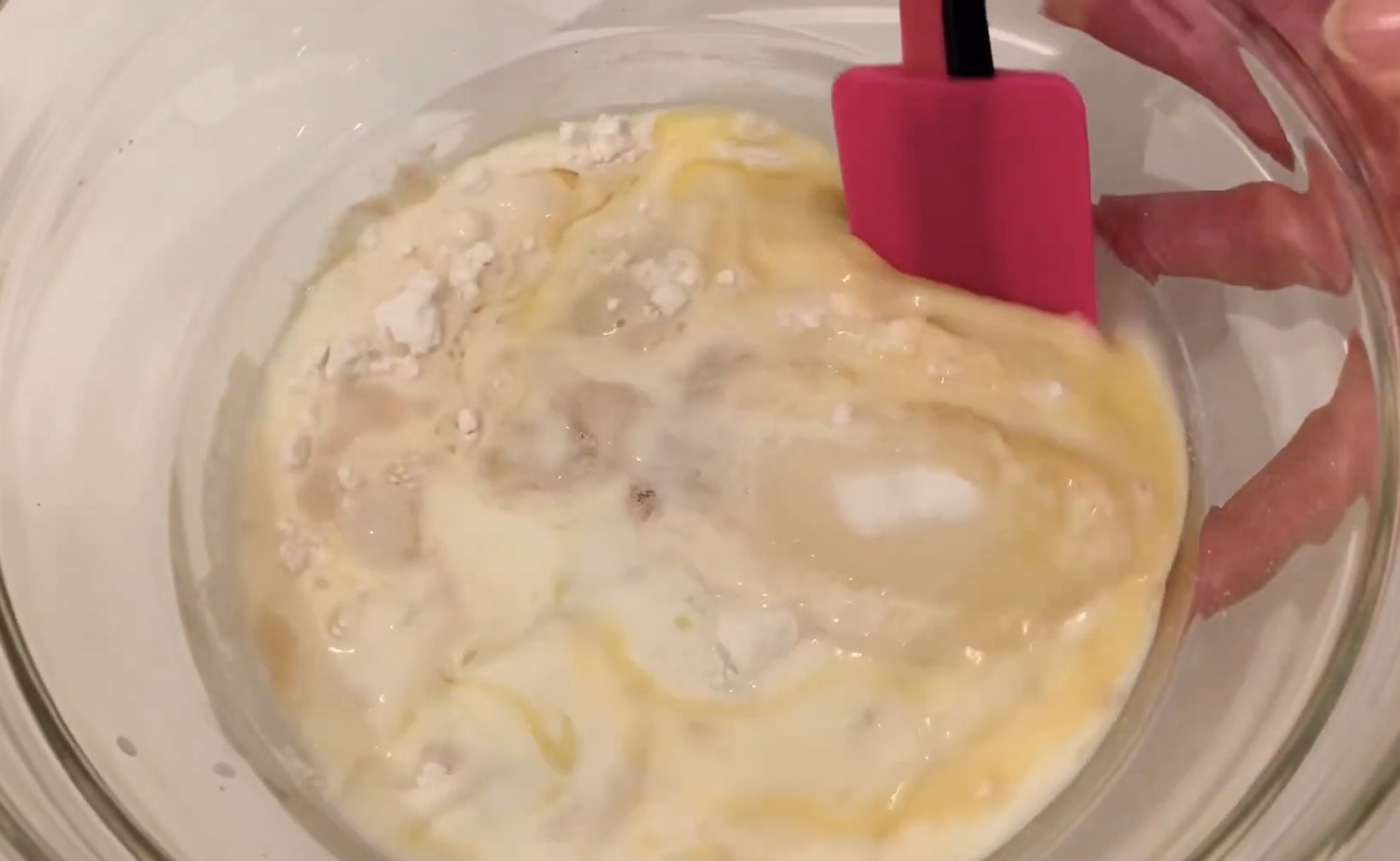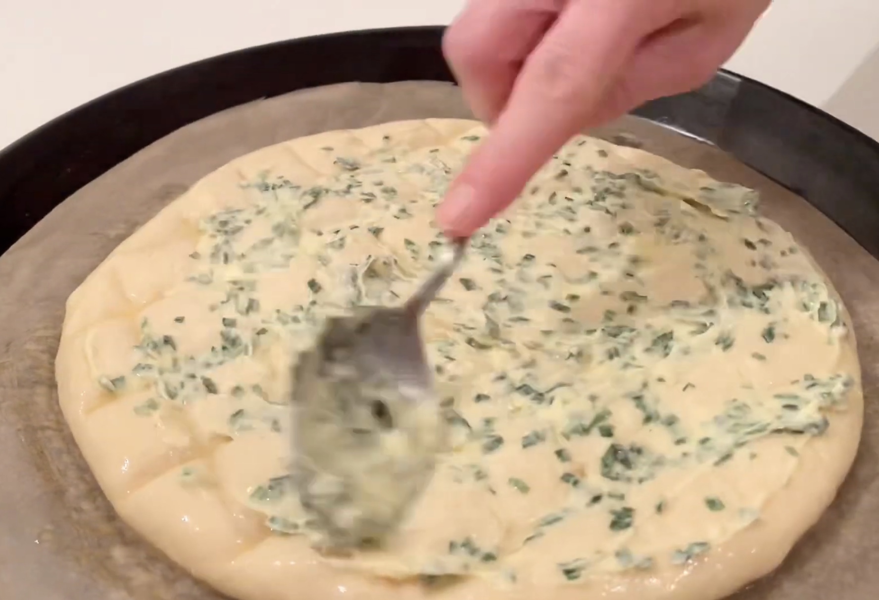 За прелив: 1 јајце, 2 супени лажици путер, 1 чешне лук, 2 супени лажици млад кромид и 2 парчиња моцарела. Постапка: Во 250 г брашно додадете 1,5 лажичка сув квасец, 2 супени лажици шеќер, ½ чајна лажичка сол, 3 супени лажици растопен путер, 1 изматено јајце, 125 мл топло млеко.