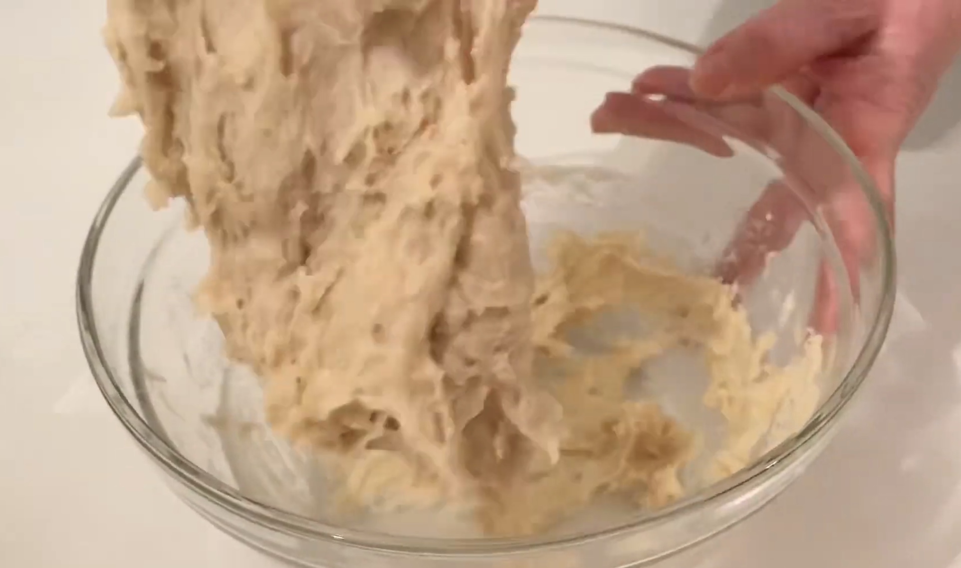 Добро промешајте прво со шпатула, а потоа со раце. Тестото е многу меко и лепливо, па потребно е да се измеси додека да се одвои од ѕидовите на садот.