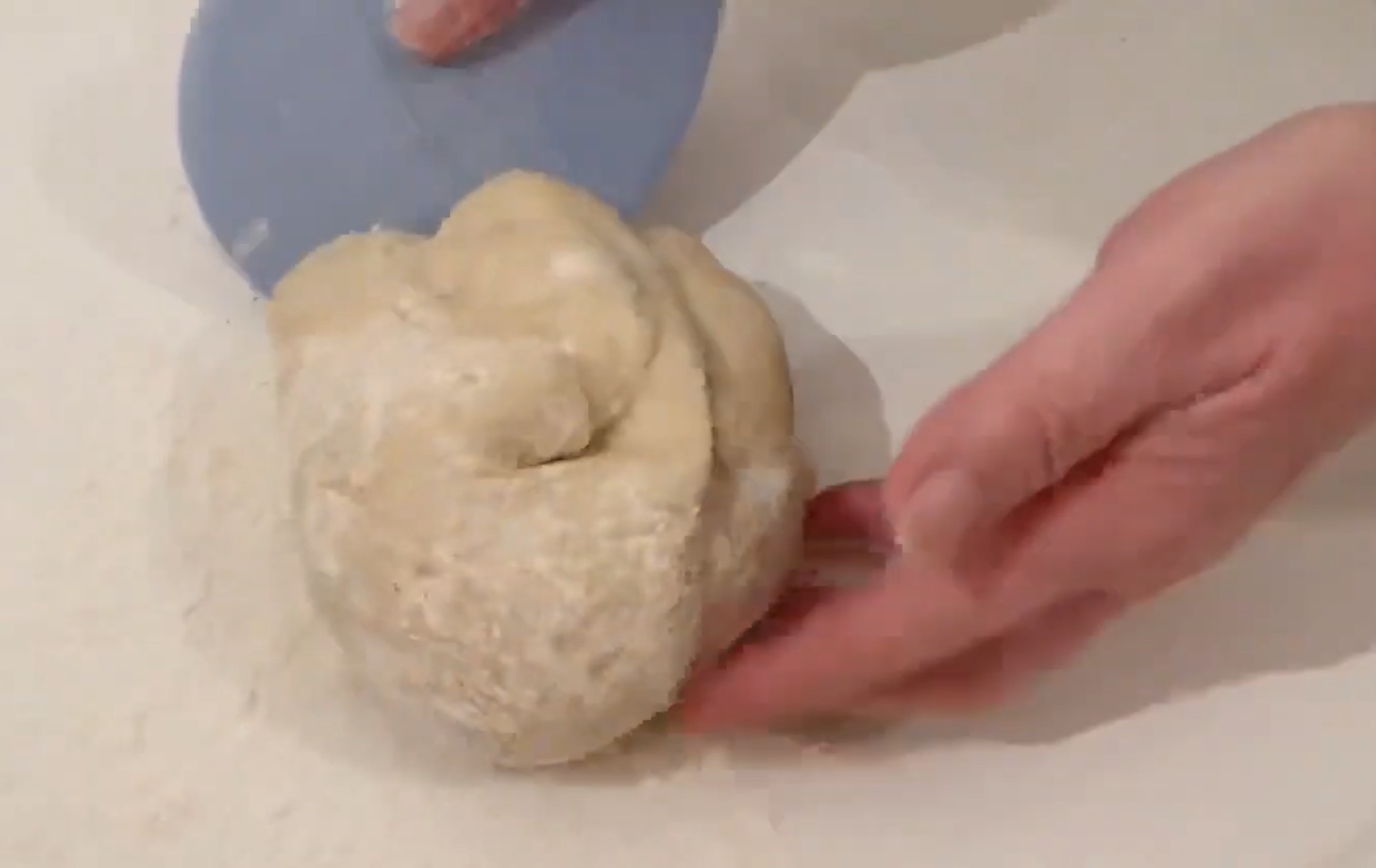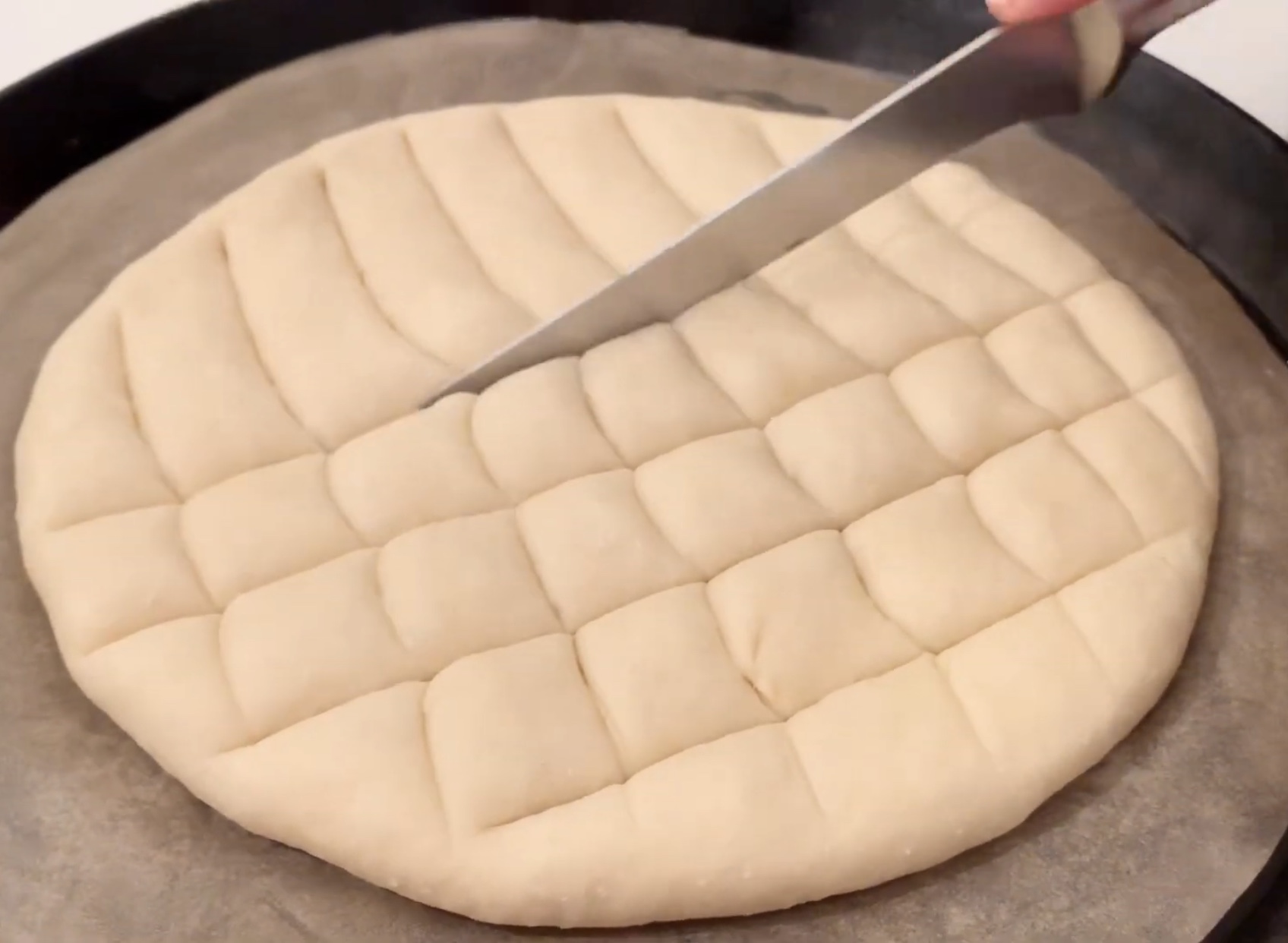 Стасаното тесто малку истапкајте го со дланките како тесто за пица, само подебело, а потоа со со остар нож исечете го на ленти со растојание од приближно 1,5-2 см, а потоа и на коцки.