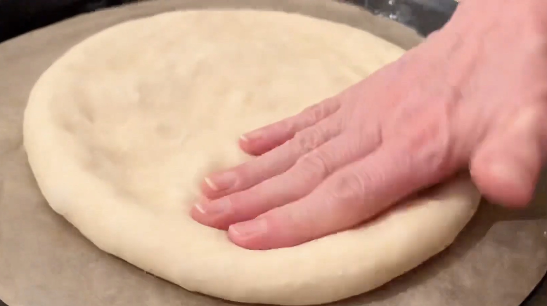 Префрлете го на набрашнета работна површина, нежно премесете го и формирајте топка. Префрлете го тестото во претходно обложена со хартија и малку намастена тепсија и прекријте го со проѕирна фолија. Оставете го да стасува околу половина час.