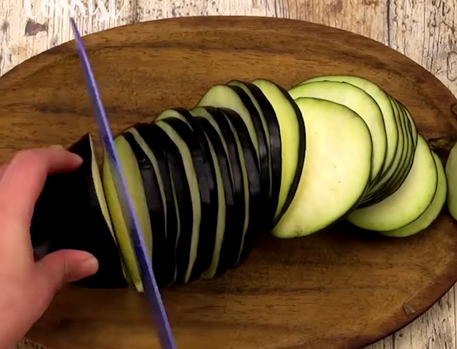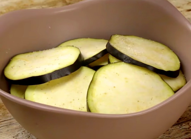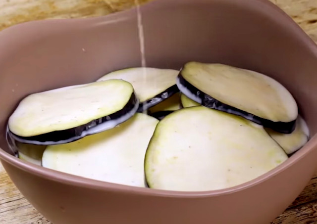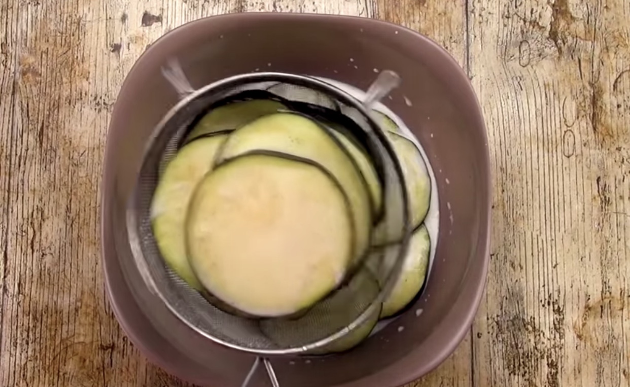 Модрите патлиџани исечете ги на тенки кругови. Ставете ги во еден сад и посолете ги со малку сол. Потоа прелијте ги со 400 мл млеко.