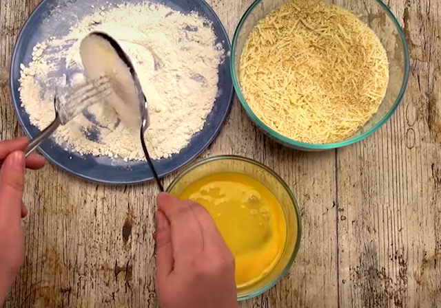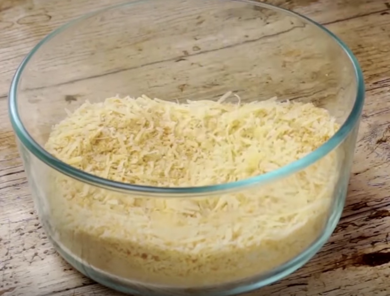 Оставете ги 10-15 минути а потоа процедете ги. Изрендајте ситно 50 г кашкавал, додајте една лажичка лук во прав и 60 г лебни трошки. Добро промешјте за да се изедначат.