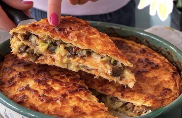 Комбинацијата од компир, праз и шампињони дава богат вкус и полн фил, а техниката со доматен сос и вода создава совршена текстура – крцкава кора и сочна внатрешност.