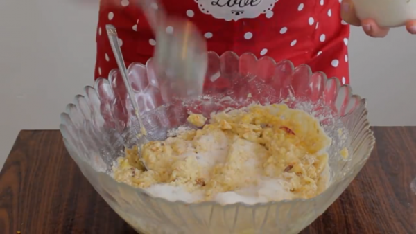 Потоа постепено влажните состојки додадете ги во сувите, убаво промешајте и на крај додадете четири лажици шеќер.