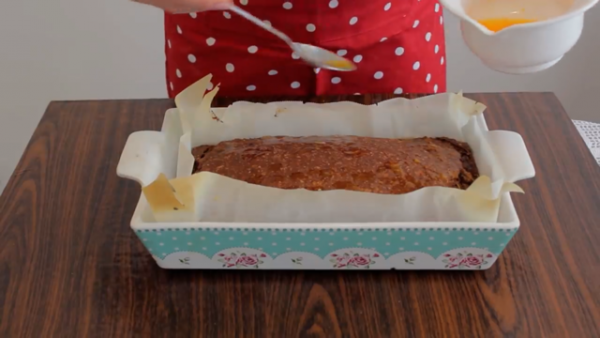 Помала тепсија обложете ја со хартија за печење, па излејте ја во неа смесата и израмнете. Ставете да се пече во загреана рерна на 200 степени околу 25-30 минути.