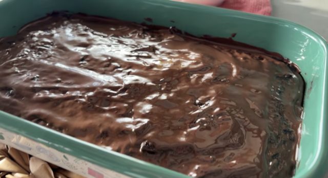 8. Растопете посно чоколадо со 1 лажица масло, па сипете ја глазурата врз колачот и рамномерно премачкајте.