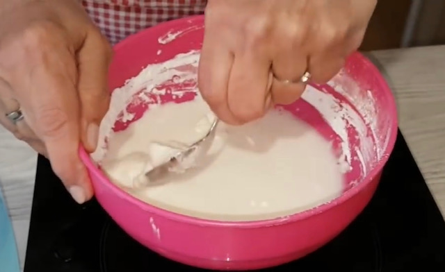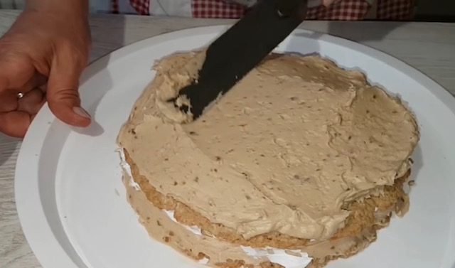 На страна изматете го шлагот и започнете со филување на тортата. Врз првата кора нанесете третина од филот и убаво израмнете, па ставете третина од крем шлагот. Постапката повторете ја со трите кори.