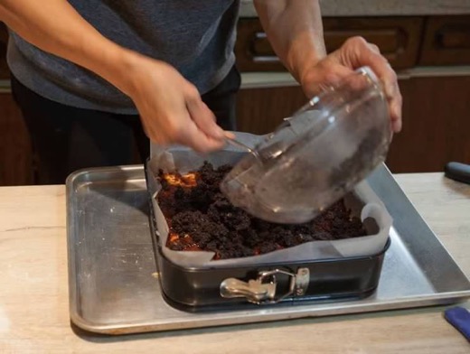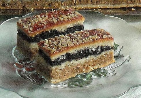 Печената пита превртете ја на чинија за послужување, така што слојот од мелен мак ќе биде најгоре. Уште додека е топла премачкајте ја со џем од кајсии и наросете мелени ореви.