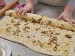 Секое топче тесто развлечете го со сyкало во тенка кора. Распоредете дел од филот и свиткајте ролна. Ролните редете ги во плех.
