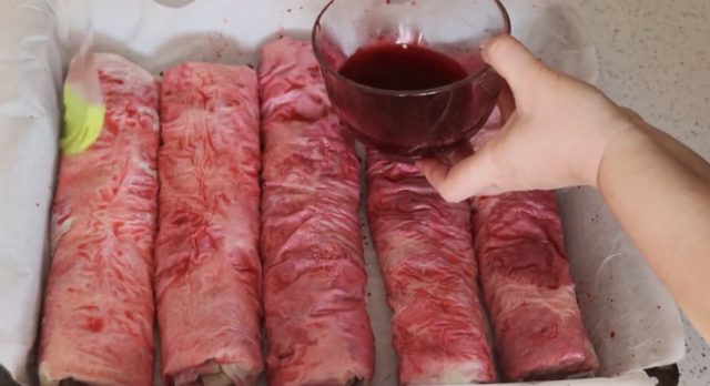 Одвојте по четири кори за секој ролат. Трите кори попрскајте ги со изладениот прелив, а врз четвртата рамномерно распоредете фил. Завиткајте во ролат и наредете во тава.