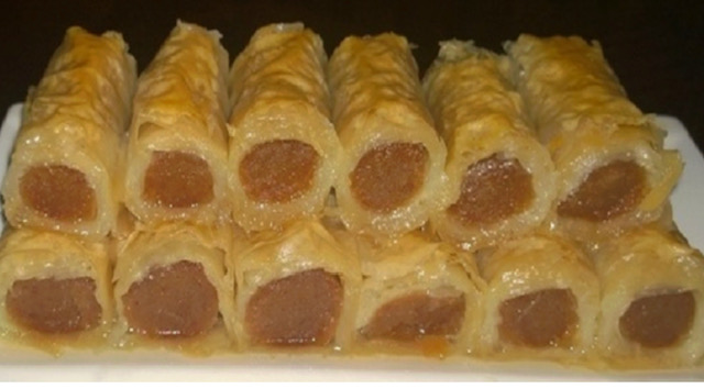 Земете правоаголна тепсија, наредете 4-5 кори една врз друга и премачкајте ги со путер. Потоа распоредете фил и свиткајте како ролат.