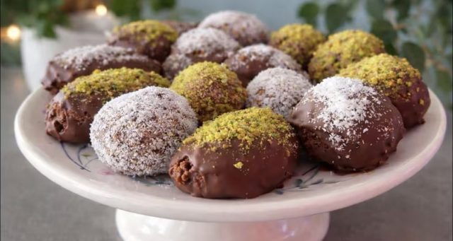 5. Дел од топчињата валајте ги во кокос, други во мелени фстаци, а трети потопувајте ги во растопено црно чоколадо.
