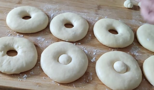 10. Со мала чашка или калап за шлаг направете дупче во средината на секоја крофна. Малите парчиња тесто можете повторно да ги соедините и да оформите уште една крофна.