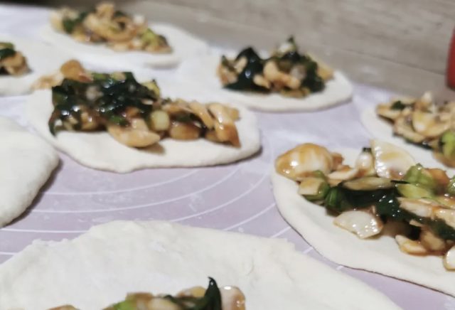 Од стасаното тесто развлечете кора со дебелина околу 0.5 см. Со чаша или калап вадете кругови.