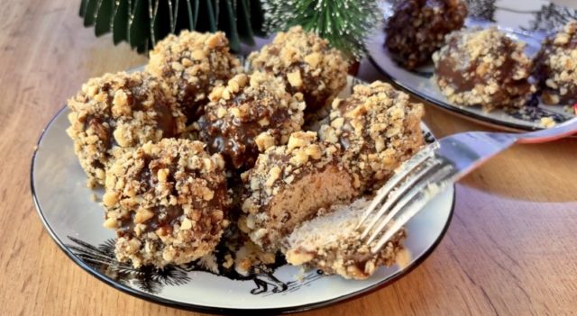 Додајте ги мелените или ситно сечканите ореви (или лешници) и добро измешајте. Потоа постепено додајте го кокосот, мешајќи додека да се добие компактна смеса.