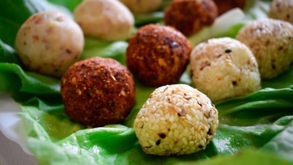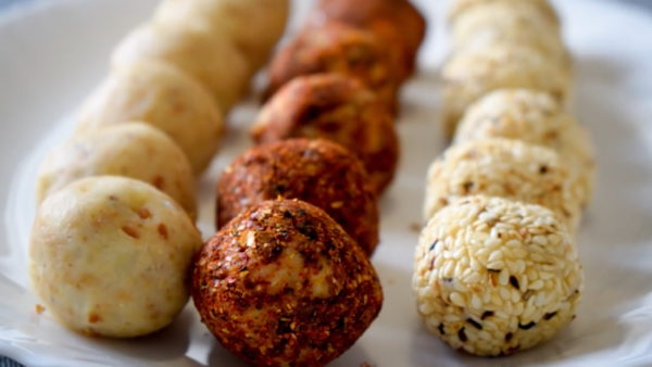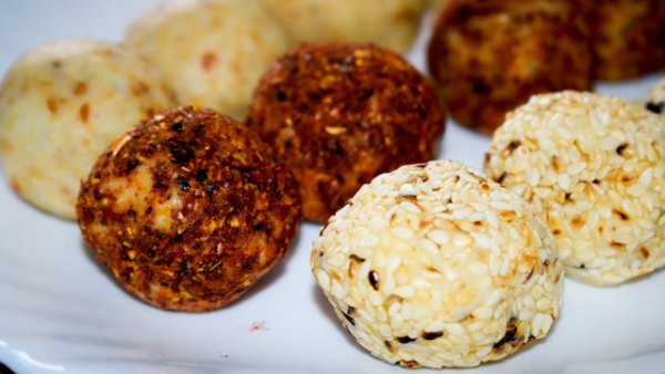 Од смесата со сусам вадете топчиња и валкајте ги во сусам. Од смесата со морков вадете топчиња и валкајте ги во толчена црвена пиперка.