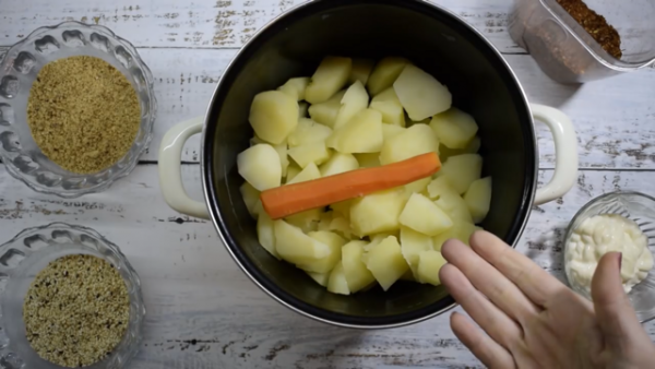 Постапка: Компирот убаво измијте го, излупете го и исечете го на крупни коцки. Посолете го и ставете го во тенџере заедно со еден морков. Долејте вода за да бидат компирите покриени, па сварете ги. Морковот тргнете го на страна, а варените компири изгмечете ги како пире.