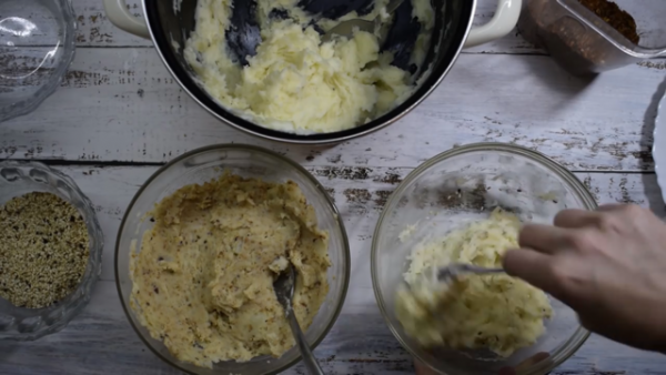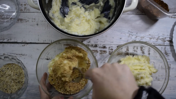 Промешајте за да се изедначи смесата. Ова е основата која треба да се подели на три дела. Во првиот дел додадете ги кикириките и промешајте да се изедначи. Во втората смеса додадете 1,5 лажица сусам и промешајте. Во третиот дел додадете рендан морков (кој претходно се вареше со компирот.