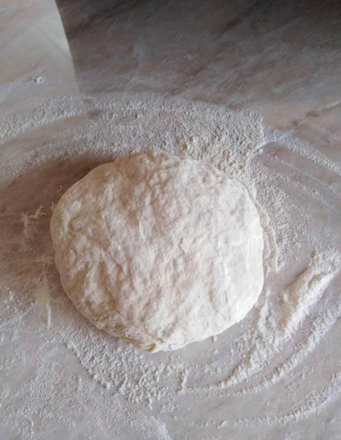 Во еден сад се става 250 г брашно, 2 лажици масло, 1 лажичка сол, 200 мл млака вода и се замесува тесто како за пита. Ќе ви биде потребно уште околу 100 г брашно за месењето на тестото.