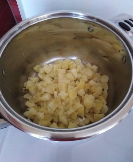 Сварете 3-4 поголеми компири исечени на коцки. Кога е сварен компирот процедете го и префрлете го во поголем сад. После компирот се приготвува тестото.