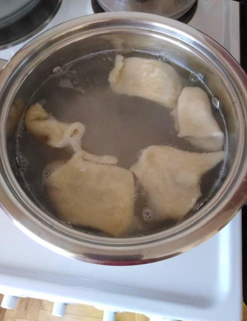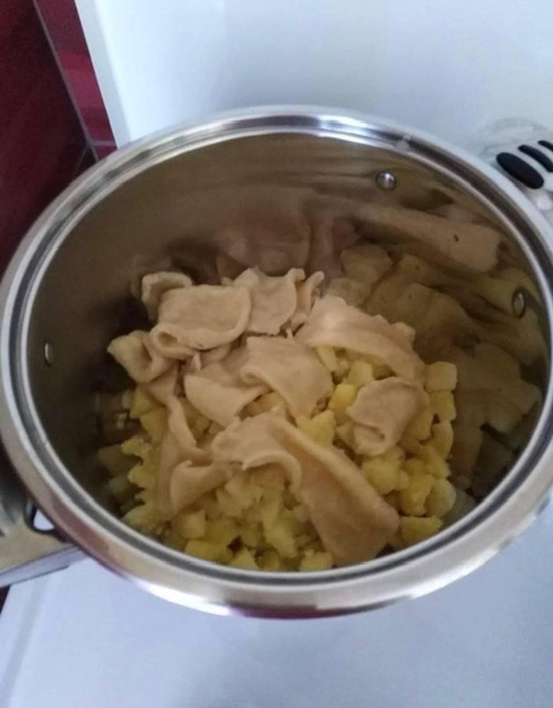 Кога тестоо е замесено се развлекува во кора како за пица и се сече на коцки. Тенџере со вода се става на оган, па кога ќе зоврие водата внатре се спуштаат коцките тесто. Кога ќе исплива на површина готово е.