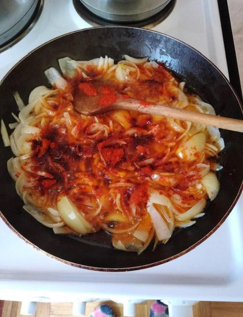 Кромидот исечете го на ленти и ставете го во тава со масло. Динстајте го додека да омекне, па додадете 2 лажички слатка пиперка и половина лажичка црн пипер. Промешајте.