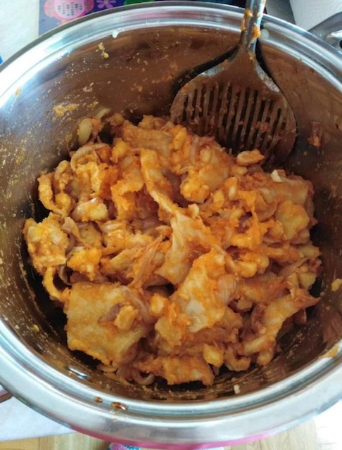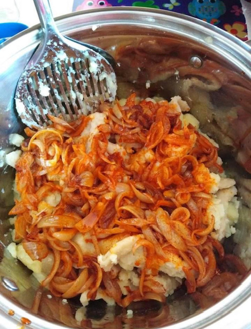 Кога ќе се соедини, полека додадете го пржениот кромид и малку од маслото во кое се пржеше. Не го додавајте целото масло за да не ви излезе премасно јадењето, туку по вкус.