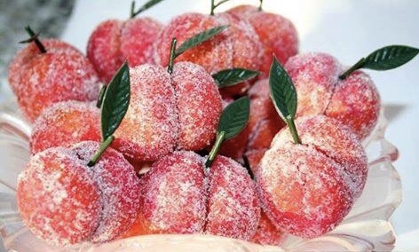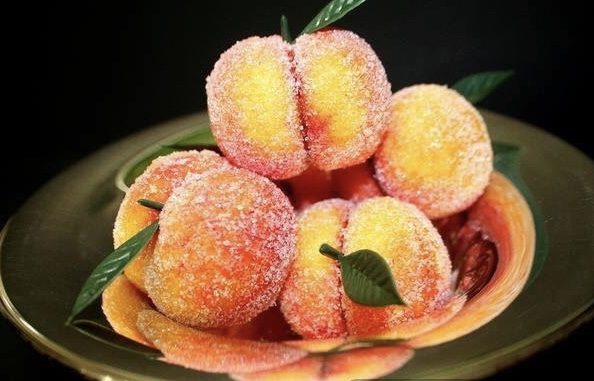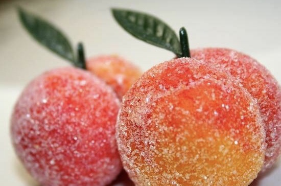 10.Натопените праски наредете ги на плех обложен со хартија, за малку да се исцедат, направете 5-6 праски, па извалкајте ги во ситен шеќер и оставете ги во чинија обложена со хартија.