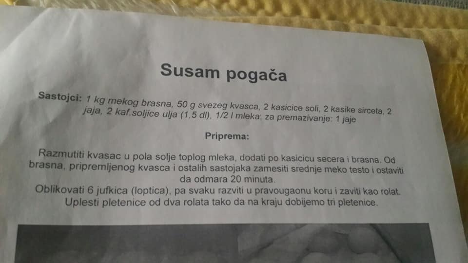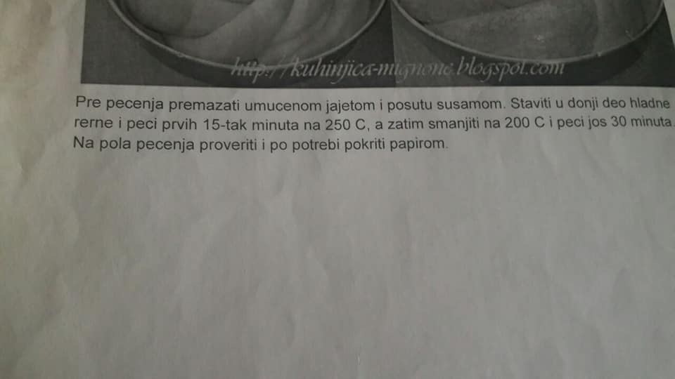 Фотографија и рецепт на Анѓелка Манојловиќ. Потребни состојки: 1 кг меко брашно, 50 г свеж квасец, 2 лажички сол, 2 лажици виснки оцет, 2 јајца, 2 кафени шолји масло (150 мл) и 500 мл млеко. За премачкување: 1 јајце и за наросување сусам
