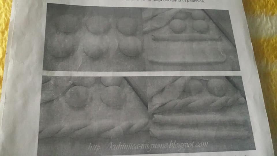 Обликувајте 6 топки, па секоја развлечете ја во правоаголна кора и свиткајте ја како ролат. Исплетете плетенки од два ролати (со сучење), така што на крајот добиваме три плетенки.