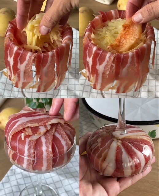 – Обложете ја внатрешноста на чашата или калапот со тенки парчиња панцета, така што краевите на панцетата да висат над работ.
