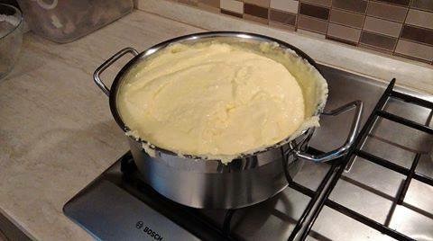 Добиената смеса ставете ја на оган и лесно мешајте додека да зоврие и да згусне. Тргнете од оган, додадете го набубрениот желатин и мешајте додека желатинот да се растопи.