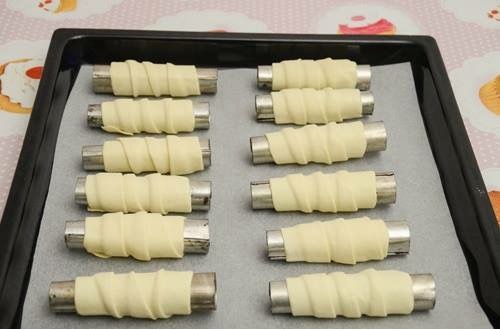 Одмрзнатото лиснато тесто исучете го тенко на побрашнета работна површина, така да добиете 12 ленти (24 калапи).