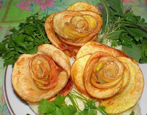 4.Врз лентата редете тркалца компир така што ќе се преклопуваат на половината.