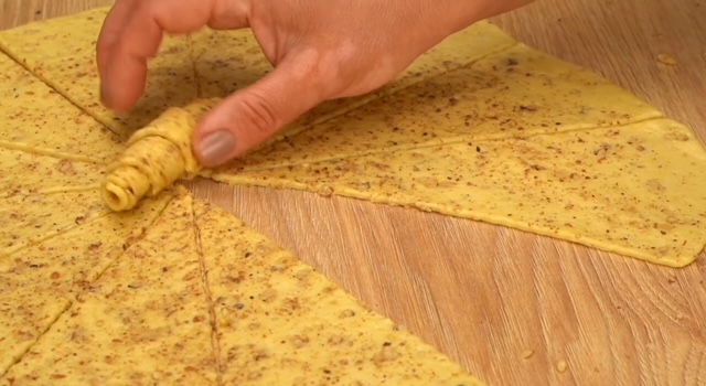 6. Тестото поделете ги на 4 дела, а од секој формирајте топче. Сплескајте го со раката врз куп мелени ореви (од двете страни), а потоа со оклагија развлечете тенка кора. Исечете триаголници и свиткајте ги кифличките.