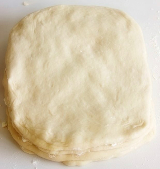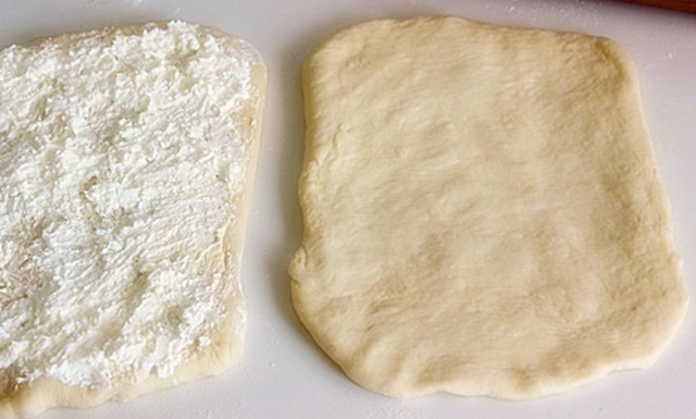 Изматете го путерот на собна температура за да може да се размачкува по тестото. Сирењето посолете го ако не е солено. Стасаното тесто поделете го на четири еднакви делови, и секој развлечете го во праволаголник со приближно 1 см дебелина.