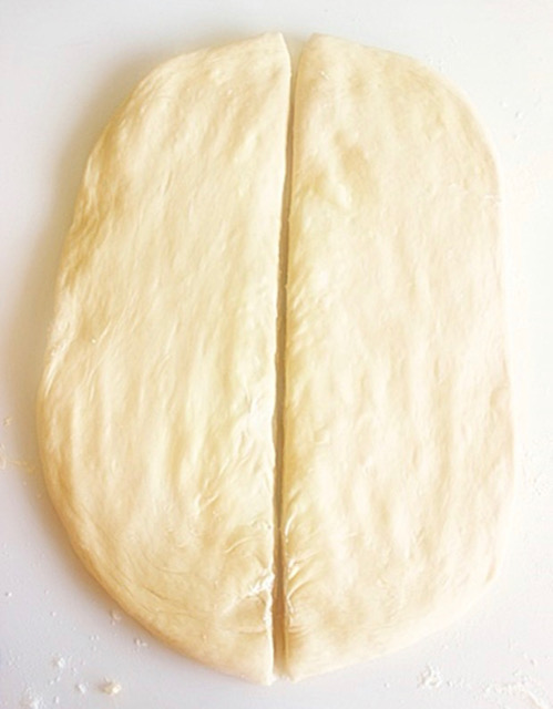 Потоа со дланкте започнете да го притискате тестото одозгора за да се рашири, за да добиете правоаголник со величина од 28х40 см. Тестото прво пресечете го на половина, а потоа секоја половина уште двапати, за на крај да добиете 6 ленти тесто.