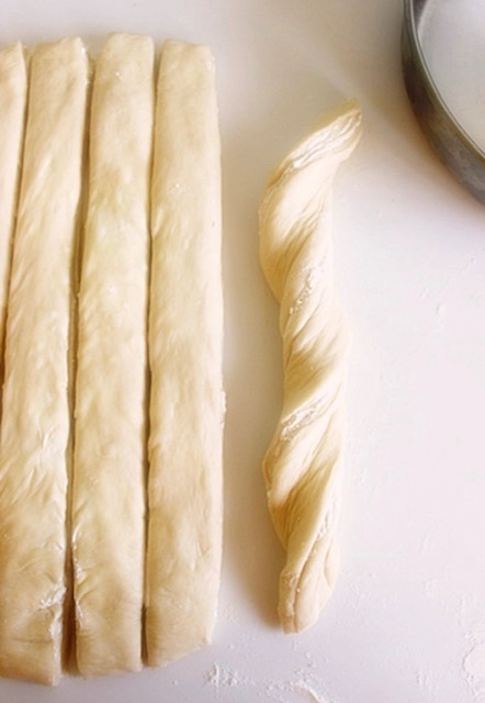 Секоја лента малку засучете ја спирално(како за влашка пита), од половина на едната, а другата половина на другата страна. Да не се растегнува лентата, туку само да се увртува.