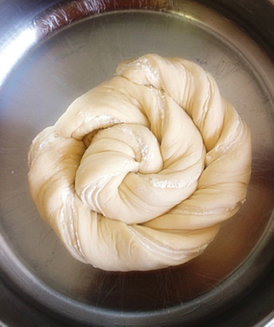 Во просеано брашно додадете ги сите состојки и преостанатото млако млеко, па замесете меко и мазно тесто. Оставете го покриено да стасува на топло место околу еден час, додека убаво да се удвои.