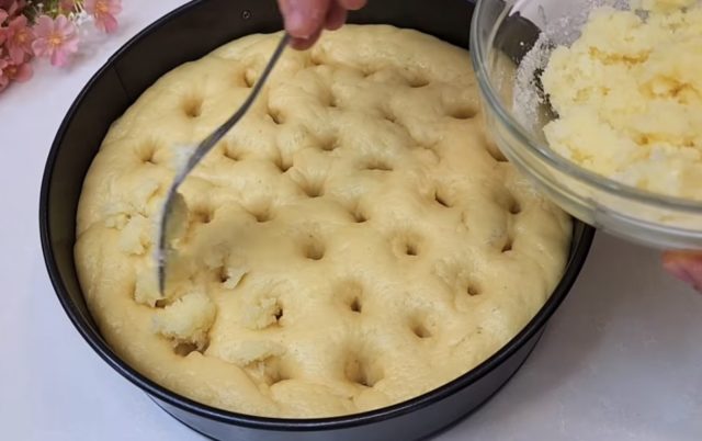 8. Направете мали вдлабнатини во тестото (со дршка од дрвена лажица) и рамномерно распоредете ја смесата од путер и шеќер.