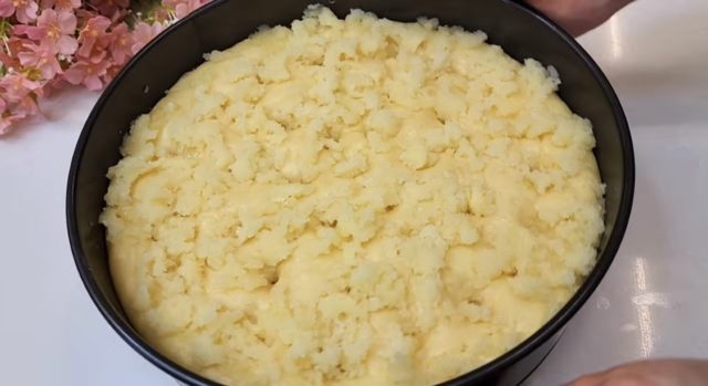 6. Калапот за торта премачкајте го со путер. Сипете го тестото без дополнително месење и со рака нежно притиснете за рамномерно да се распореди.