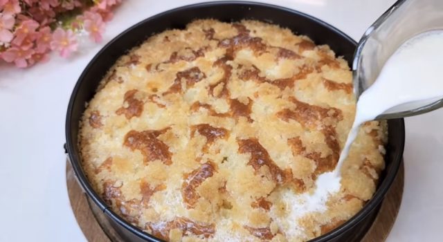 10. По печењето, рамномерно сипете 150 мл крем (11%) врз топлиот колач и оставете неколку минути да впие.