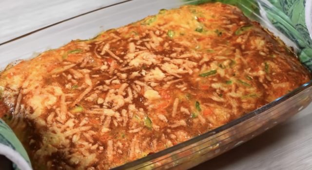 Во сад изматете јајца, млеко, масло, брашно, прашок за печиво, кашкавал и копар. Додајте го зеленчукот и промешајте.