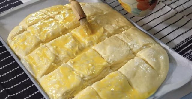11. Растегнете го тестото нежно притискајќи со дланките во правоаголен плех со димензии 43 × 27 cm. Исечете на коцки.