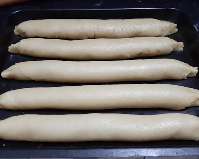 Водата и маслото се ставаат на оган да зоврие. Тенџерето се трга на страна, па се додава 1 кг брашно помешано со 1 кесичка прашок за печиво. Се меша постојано додека брашното убаво да се впие и на крај во тестото се ренда кора од еден лимон. Убаво се промешува тестото и се дели на пет еднакви делови.