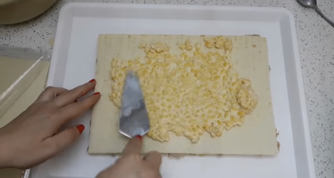 Филување: кора-фил од пченка, кора-фил од туна… додека да се потроши материјалот. Во дел од остатокот од филот што го оставивте на страна додадете малку зачинска црвена пиперка и промешајте за да добиете завршен, црвен фил, врз кој ќе ставите уште една розен кора.
