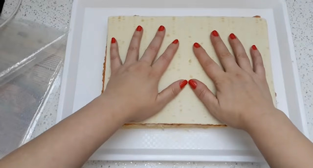 Врз тортата ставете нешто тешко за да можат корите да се стегнат, околу 20 минути. Потоа премачкајте ја тортата со остатокот од филот и одозгора наросете рендан посен кашкавал. Деталите околу постапката можете да ги погледнете во видеото ОВДЕ.
