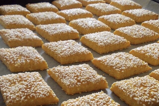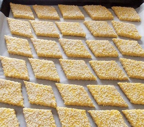 Тестото развлечете го во кора 35х25 см, премачкајте со 1/2 жолчка, наросете со сусам, превртете го тестото, па премачкајте го и од другата страна со жолчка и наросете со сусам.