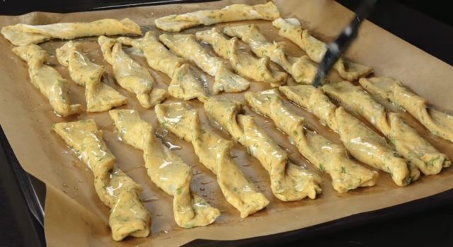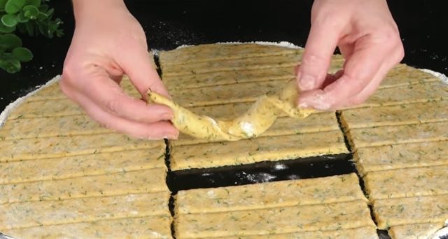 7. Тестото развлечете го на набрашнета површина во долгнавеста правоаголна кора. Исечете ленти со широчина од приближно 1,5–2 см, па спирално завиткајте ги и наредете ги во плех.