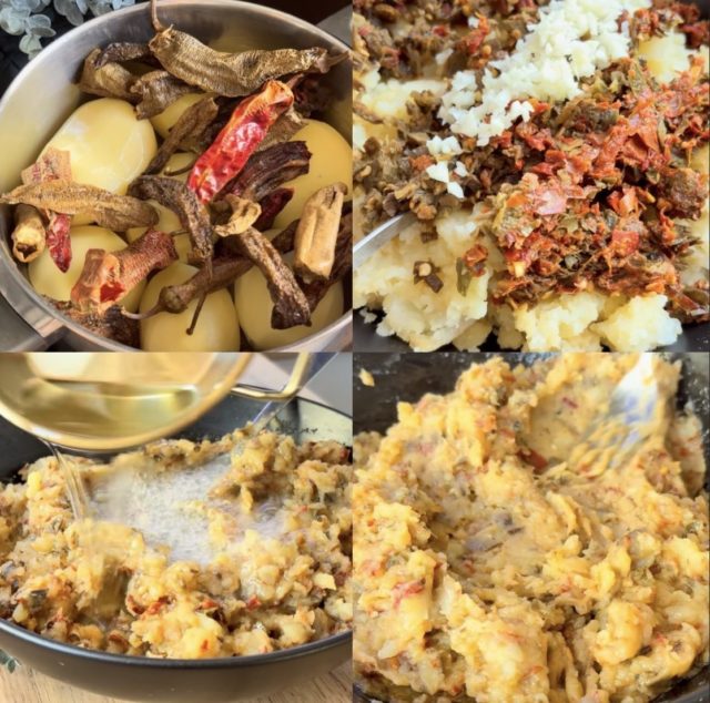 6. Додајте малку од водата во која се вареа компирите за да ја прилагодите густината на макалото. Посолете по вкус и добро измешајте.